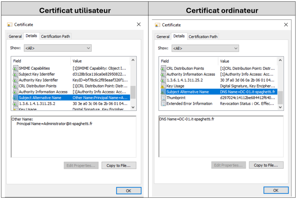 - Il est obligatoire de renseigner l’UPN de l’utilisateur / DNSHostName de la machine dans le SAN du certificat.