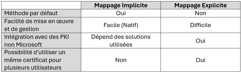 Les informations reliants le certificat à un compte de l’Active Directory sont donc renseignées directement dans le certificat, d’où l’appellation mappage Implicite.