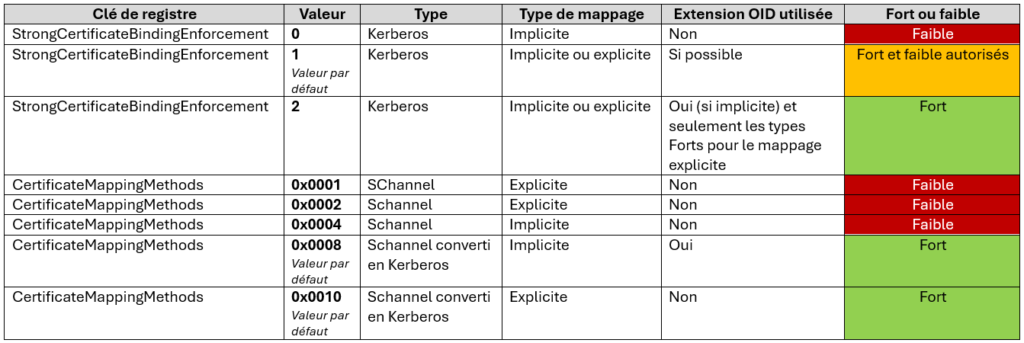 Pour le mappage implicite, l’extension szOID_NTDS_CA_SECURITY_EXT doit être présente et contenir le SID du compte AD. Tandis que pour le mappage explicite, seuls les modes de mappage forts seront acceptés pour l’authentification. Pour tous les autres cas, l’authentification sera refusée.